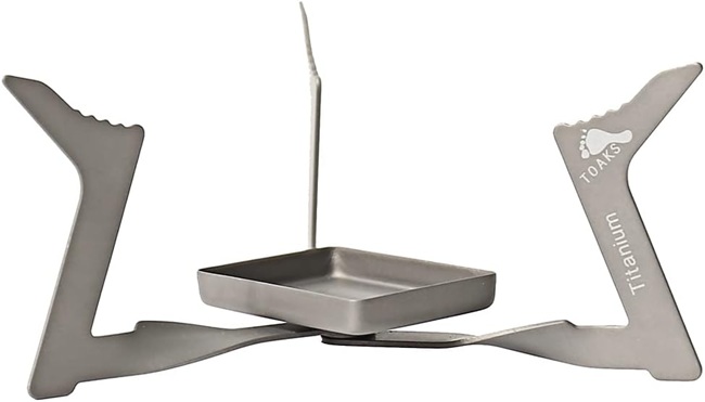 - Use with solid fuel cubes. Works well with the TOAKS titanium pot, and can accommodate a variety of pots and cups.